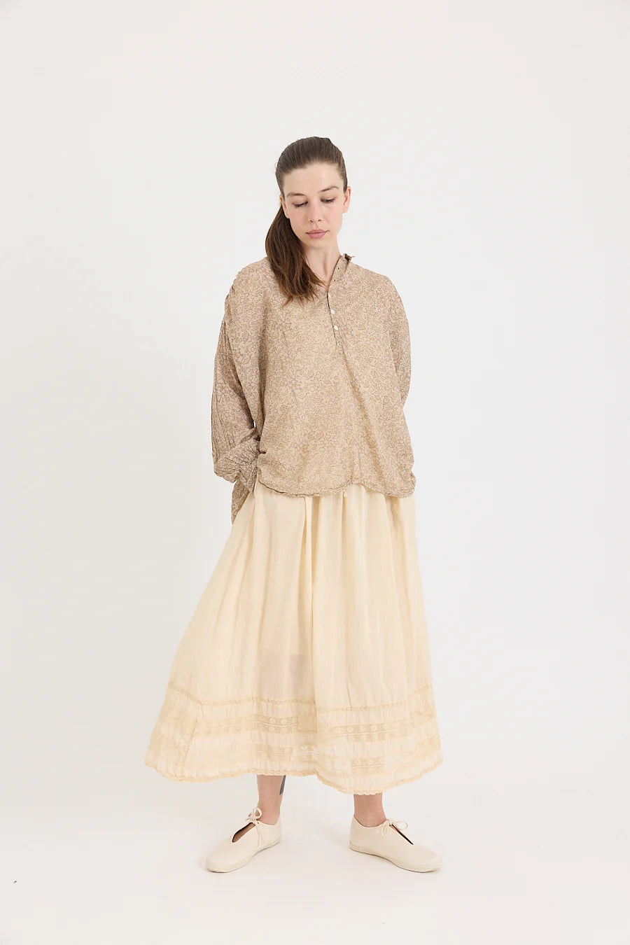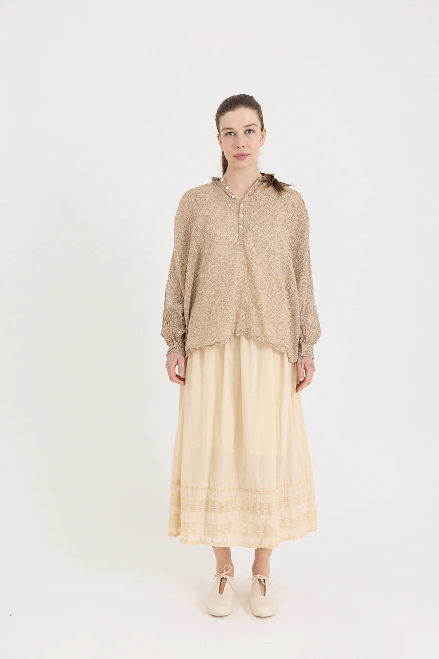 The Hill Blouse is made from very soft cotton voile, and features an elegant mandarin collar, soft gathers along the front shoulders and back yoke with delicate pin tucks on the sleeve that billow down to a slightly gathered cuff. Given the sheer properties of the cotton voile, the Hill Shirt layers beautifully over our Imogen and Camille Silk camisoles or over your own favourite under layers.