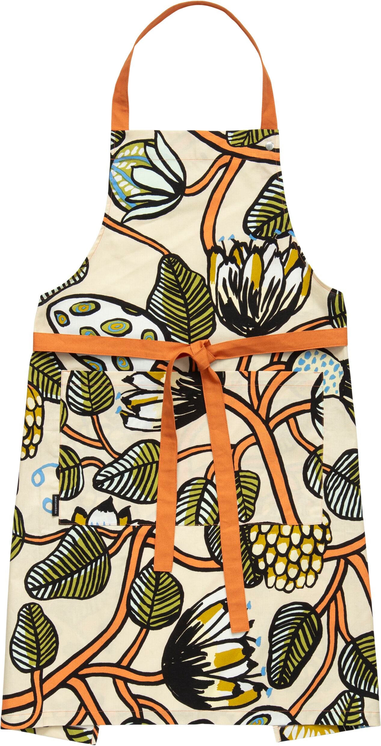 The Tiara pattern apron is printed in Helsinki. It has a front pocket and an adjustable neck band.
